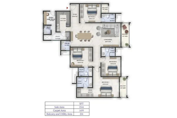 The project features thoughtfully designed 1, 2, 3, and 4 BHK apartments, each crafted to deliver spacious layouts, modern comforts, and upscale finishes. Every home is designed to offer a perfect blend of functionality and elegance, catering to the lifestyle needs of contemporary urban families.